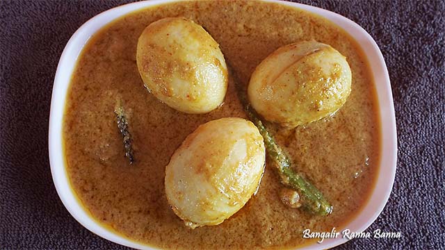 উপকরণ :- সেদ্ধ ডিম ৫টা, ঘি ১ টেবিল চামচ, সামান্য কাশ্মীরি লঙ্কার গুঁড়ো আর হলুদ গুঁড়ো, তেজপাতা ১টা, এলাচ ২টো, দারচিনি ১টা, গরম মশলা ১ চামচ এর ৪ ভাগের ১ ভাগ, লবণ পরিমাণ মতো, টক দই ১/২ কাপ, নারকেলের দুধ, আদা রুসুনের পেস্ট ১ চামচ, চিনি ১/২ চামচ, কাঁচালঙ্কা কুঁচি, ২ টো গোটা কাঁচালঙ্কা, সাদা তেল ২ চামচ, গোটা জিরে ১/২ চামচ, গোটা ধনে ১/২ চামচ, কাজুবাদাম ৫টা আর লাগছে ২টো মাঝারি মাপের পেঁয়াজ কুঁচি।